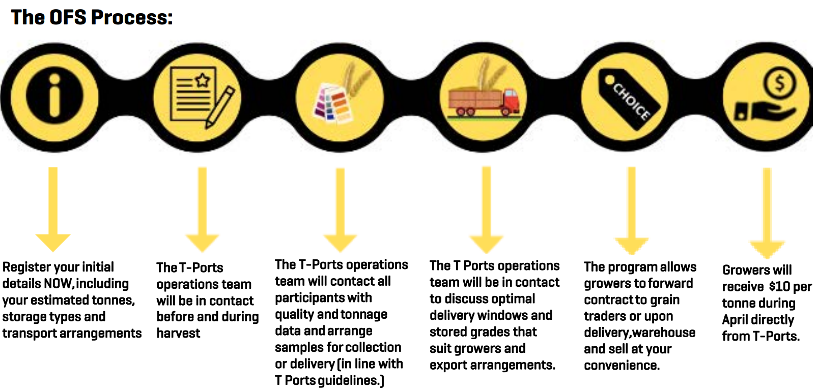 At T-Ports, we understand the pressure of harvest logistics and are pleased to support growers with our On Farm Storage (OFS) Program with a $10 per tonne payment direct to growers from T-Ports.