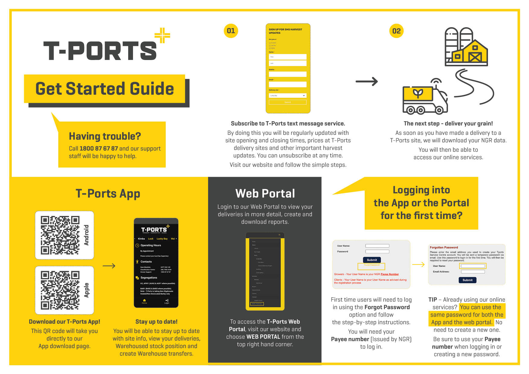 Access to the portal will be activated after you deliver for the first time to a T-Ports site. When your NGR card is presented upon delivery, this will link your data from NGR into the T-Ports online data management system. You will then be able to visit the portal and use your NGR payee number to set up an account.